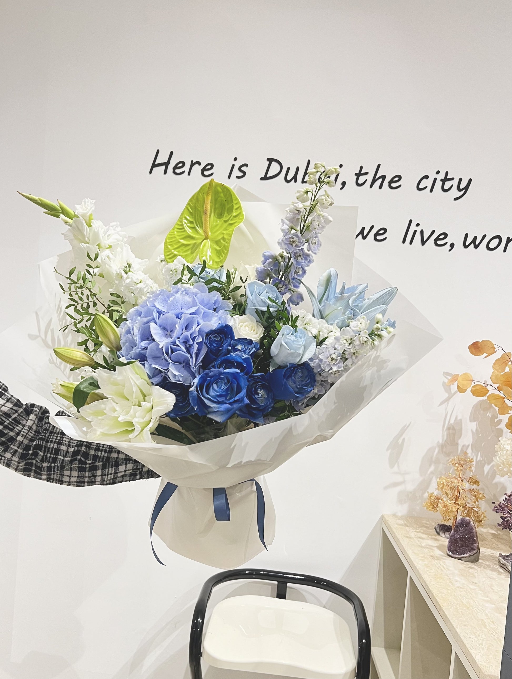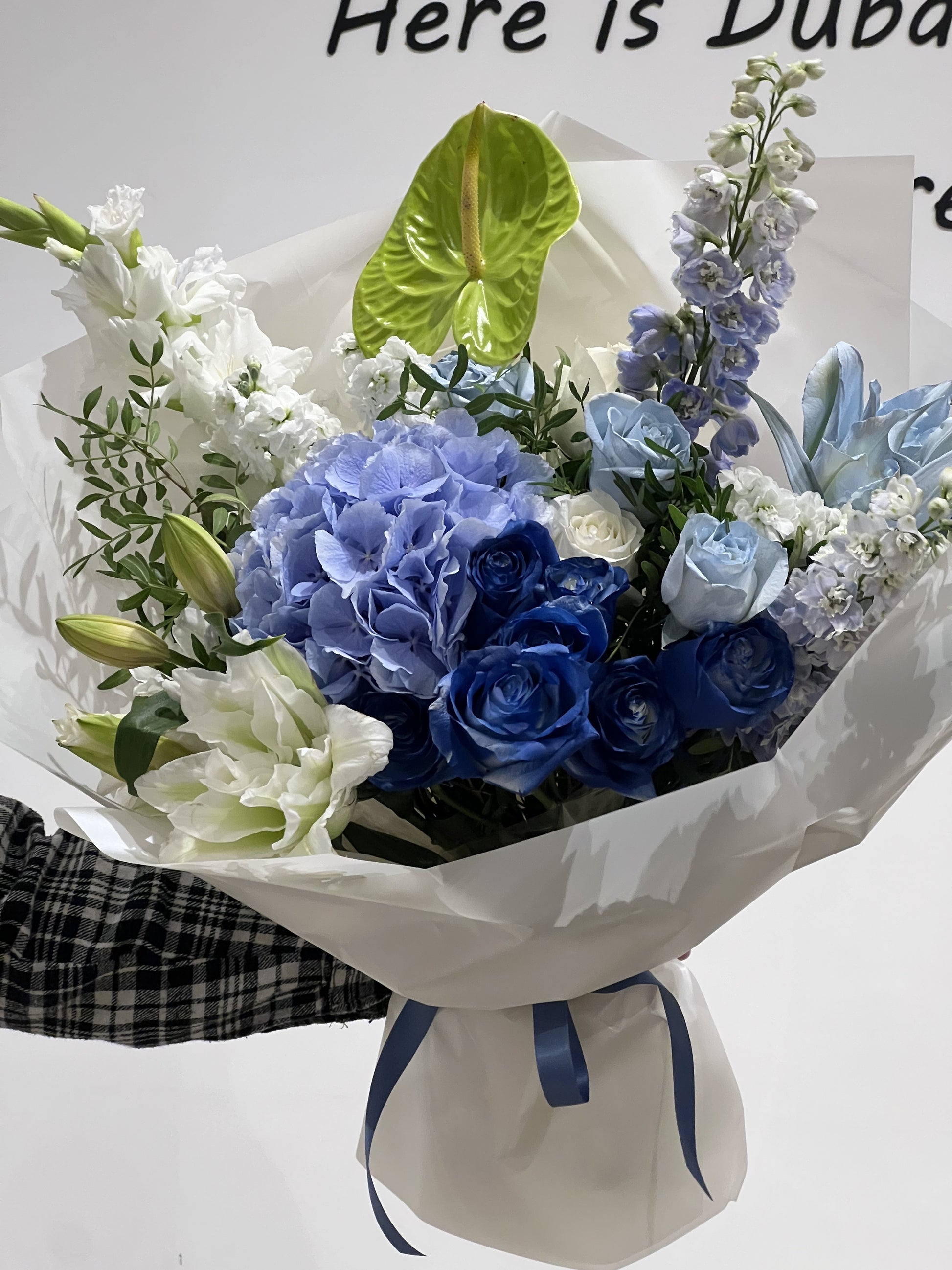This striking bouquet features a blend of vibrant blue hydrangeas, royal blue roses, and elegant white lilies, complemented by soft blue delphiniums and a unique green anthurium accent. The combination of bold blues and fresh whites, with a touch of vibrant green, evokes the serenity of the ocean and the luxury of a refined floral arrangement. Wrapped in a minimalist white cover with a matching blue ribbon, this bouquet is a perfect choice for celebrating strength, elegance, and sophistication.