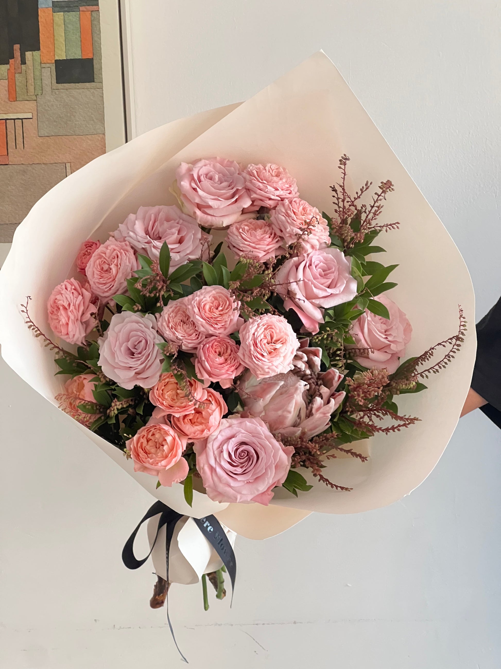This bouquet radiates a soft, romantic charm with its harmonious blend of pastel hues. It features creamy ivory roses, blush-pink lilies, and delicate eustomas, complemented by vibrant green accents and leafy textures. The addition of small berry-like details adds an organic and fresh touch, while the artistic wrapping in earthy tones and textured paper gives it a modern yet timeless aesthetic. Perfect for any special occasion, this bouquet symbolizes elegance, grace, and affection.