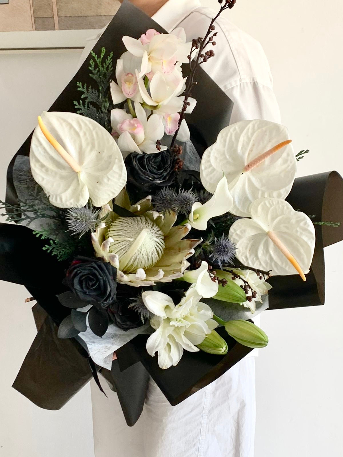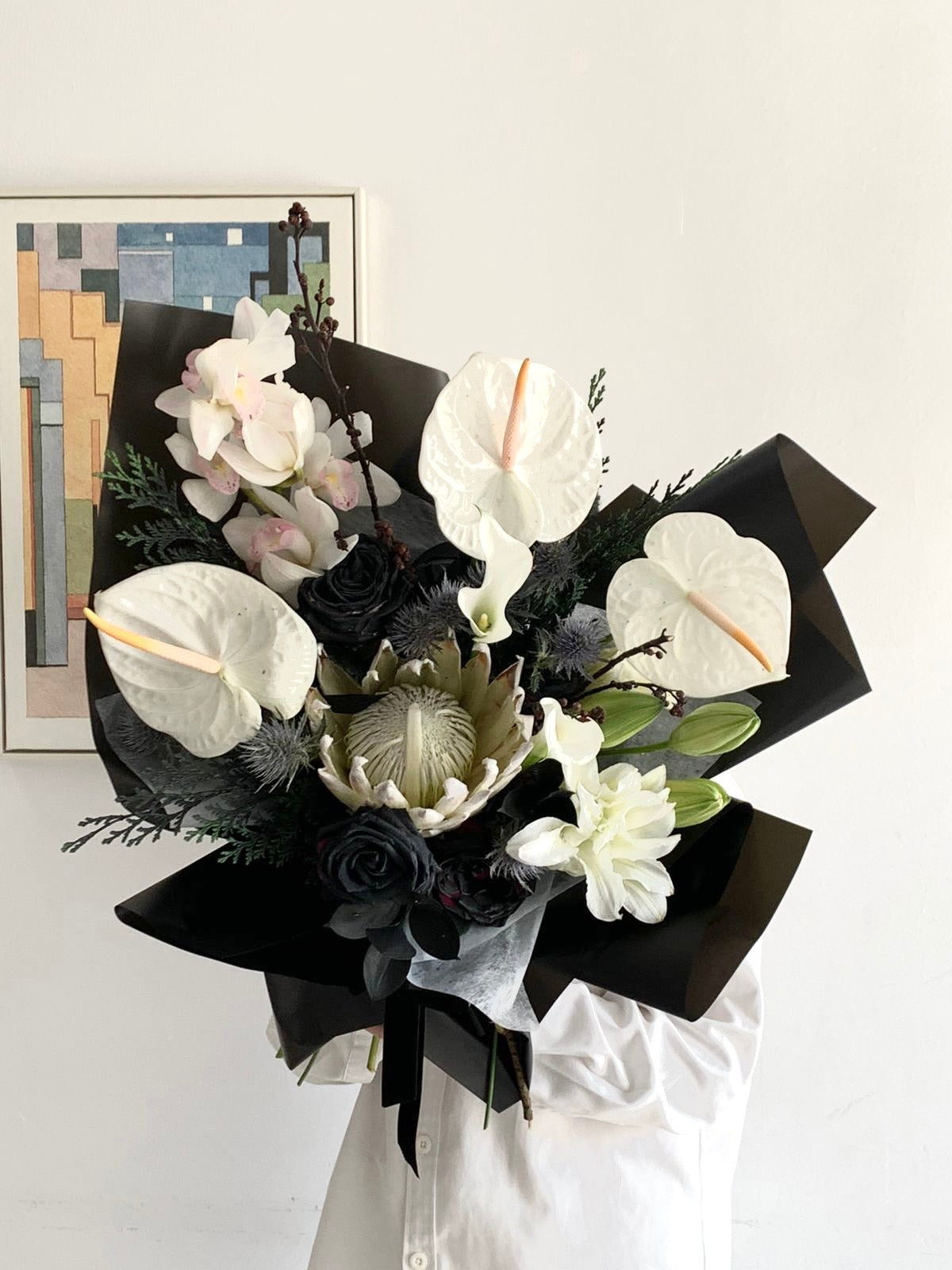 The Ethereal Noir bouquet is a stunning arrangement that blends elegance with a touch of mystery. It features pristine white anthuriums and cymbidium, symbolizing purity and sophistication, contrasted with deep black roses that add drama and depth. The centerpiece, a striking protea, exudes strength and natural beauty, complemented by delicate lilies and greenery. Wrapped in sleek black paper, this bouquet is perfect for modern minimalists who appreciate a bold yet refined aesthetic. Whether for a special occasion or as an artful gesture, Ethereal Noir captures timeless allure and contemporary charm