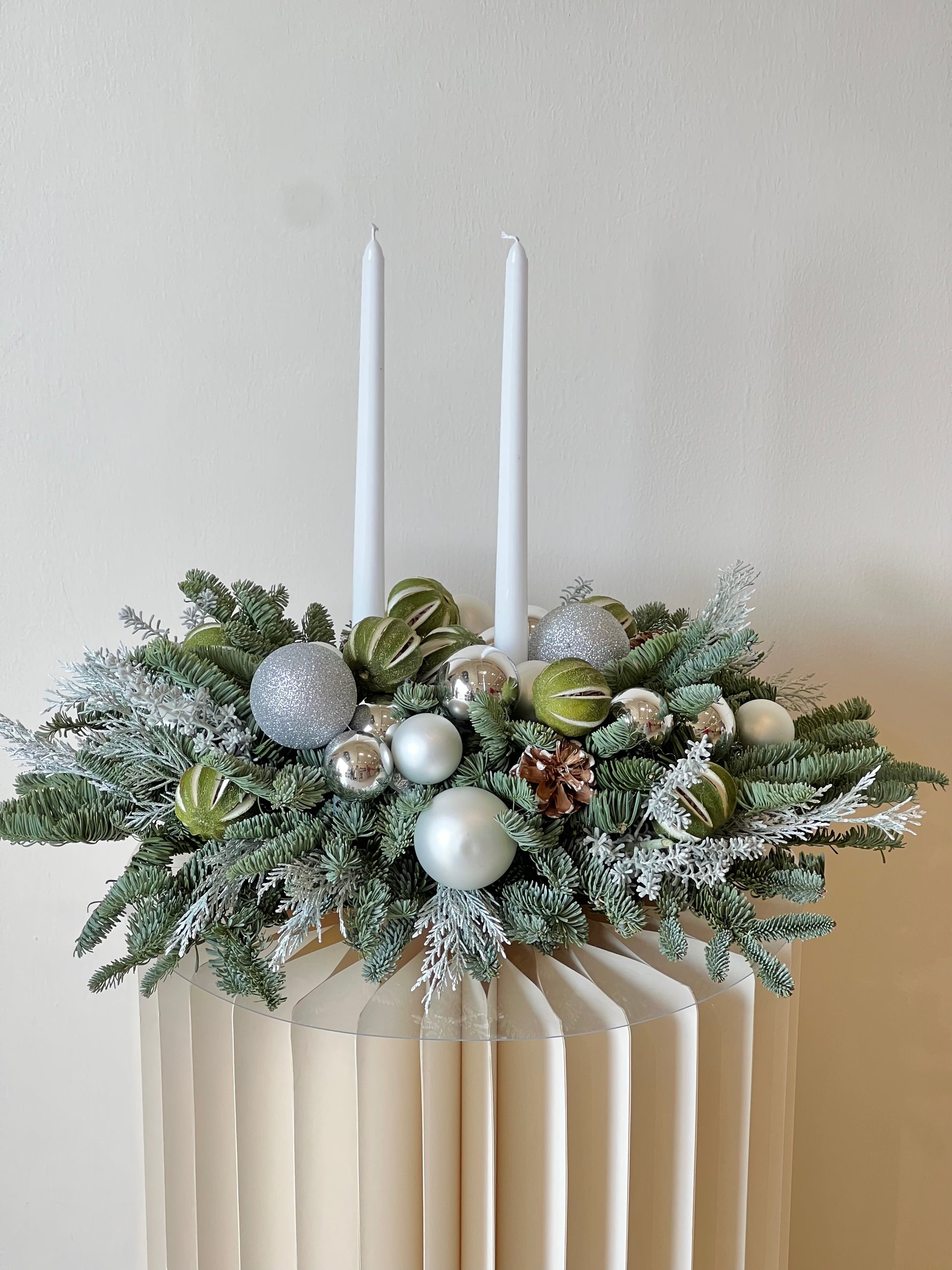 This stunning arrangement features silvery foliage, frosted pinecones, and delicate winter greens, creating a serene and sophisticated holiday centerpiece. Perfect for adding a touch of wintry charm and elegance to any festive space.