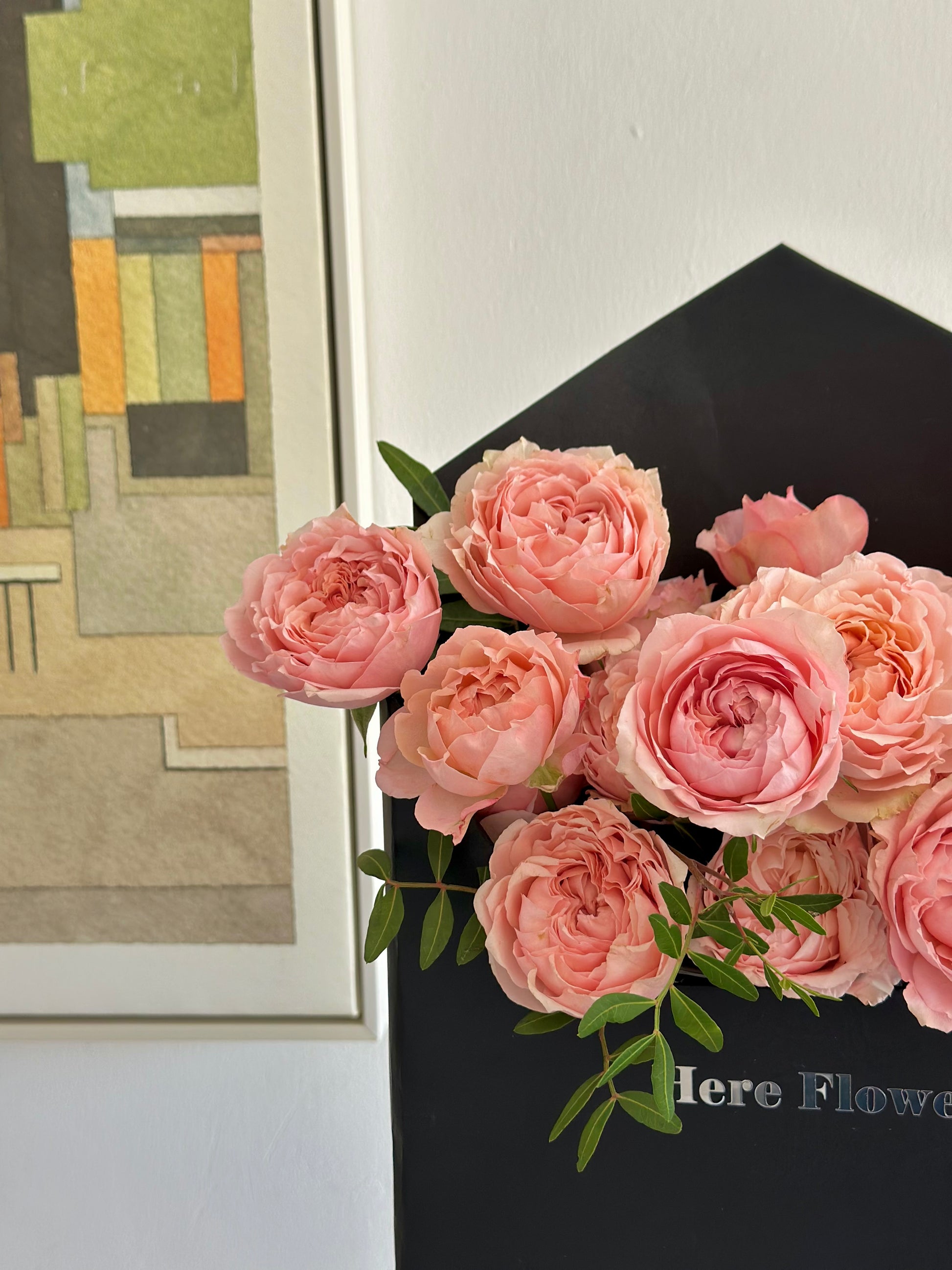 This Modern Envelope Rose Flower Box features delicate blush pink garden roses arranged in a sleek black envelope-style box.
