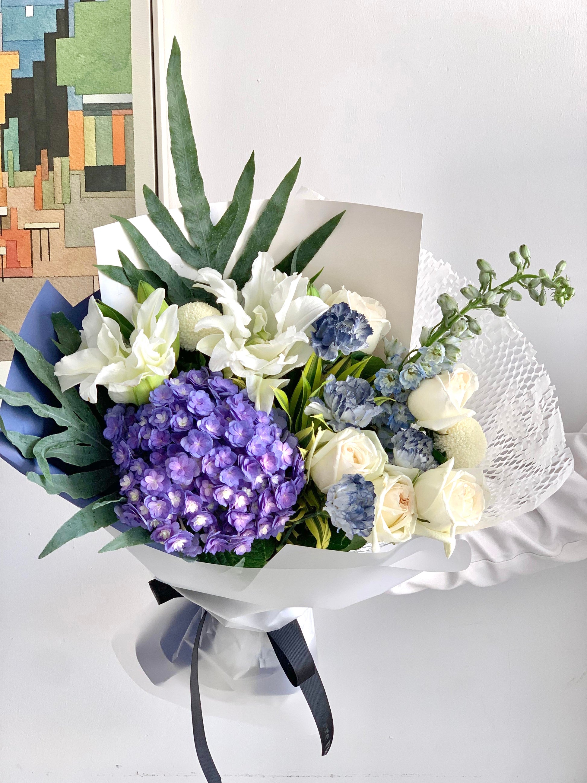 This bouquet combines cool tones of deep piurple hydrangeas, white roses, and painted blue eustoma, accented by elegant white lilies and striking greenery. The arrangement is lush and structured, creating a balanced and sophisticated aesthetic. Wrapped in white and blue, this bouquet evokes a sense of tranquility and strength, making it an ideal choice for those who appreciate natural elegance and a touch of mystery