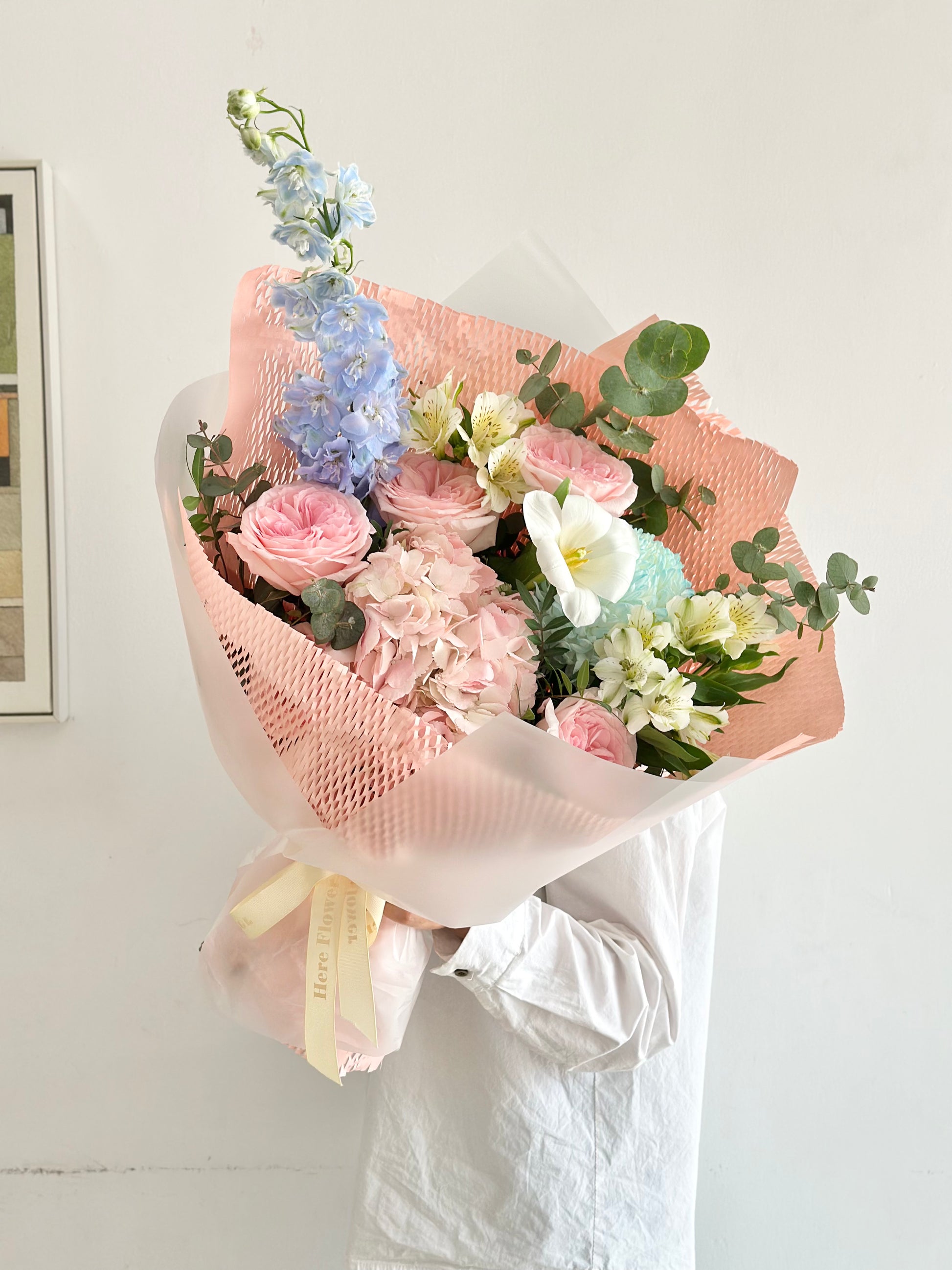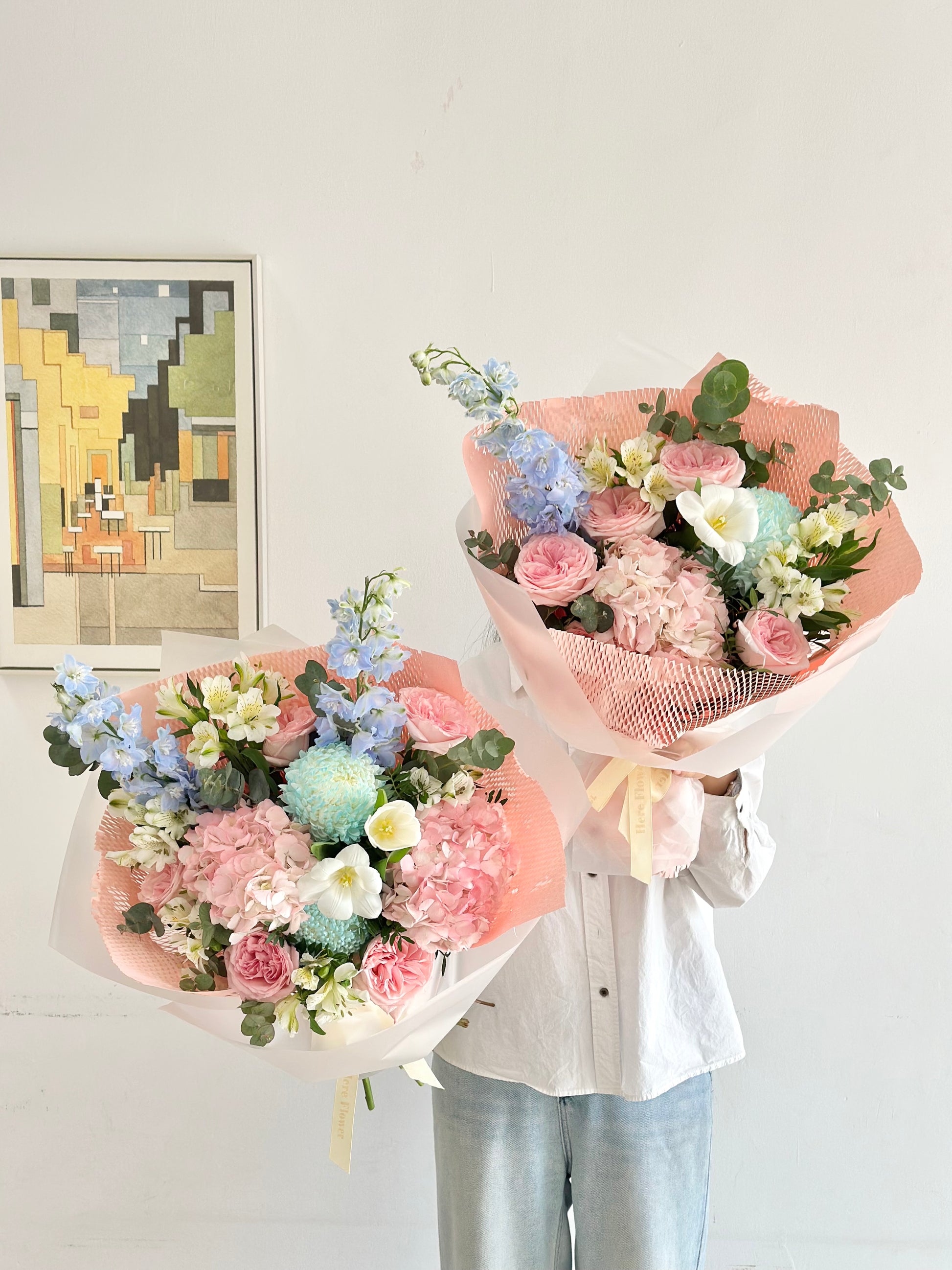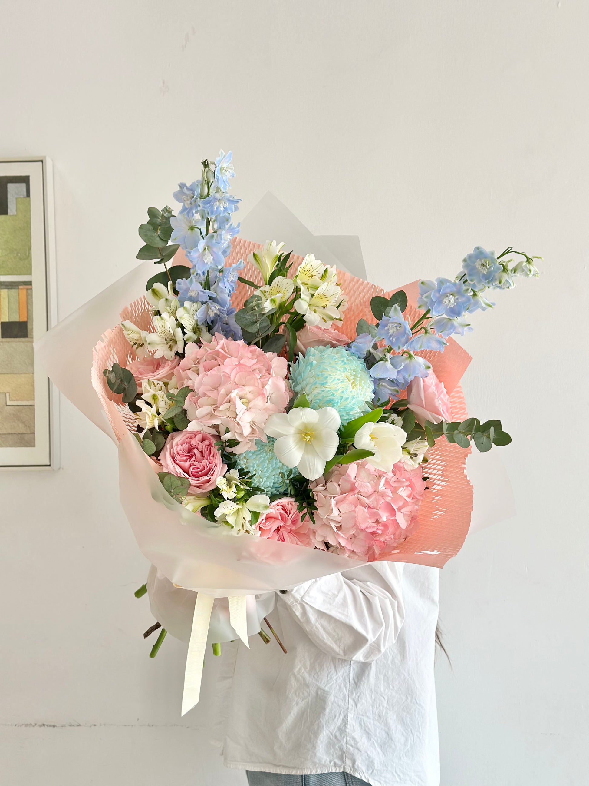 Pink Sky Garden is a romantic arrangement built around lush pink tones, featuring premium roses and hydrangeas complemented by delicate blue delphinium. The contrast of soft pink and airy blue creates a fresh, elegant composition, while touches of eucalyptus add a natural, contemporary feel. Wrapped in blush-toned paper, this bouquet is perfect for stylish, heartfelt gifting in Dubai.