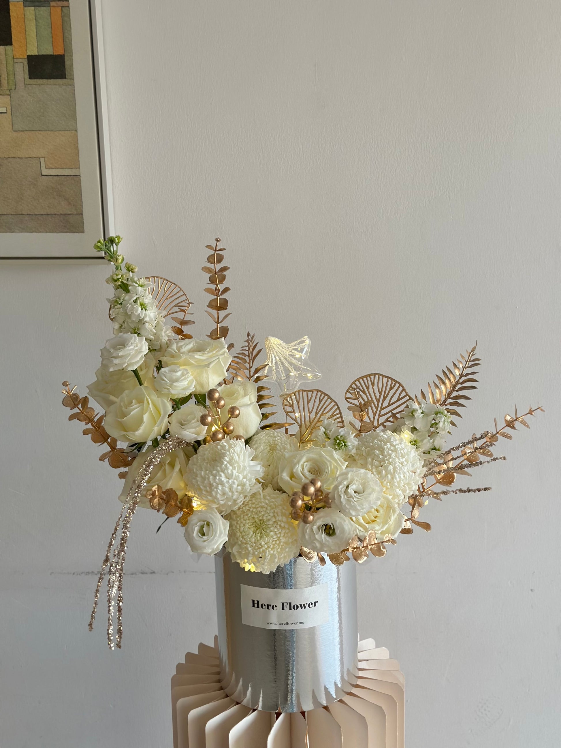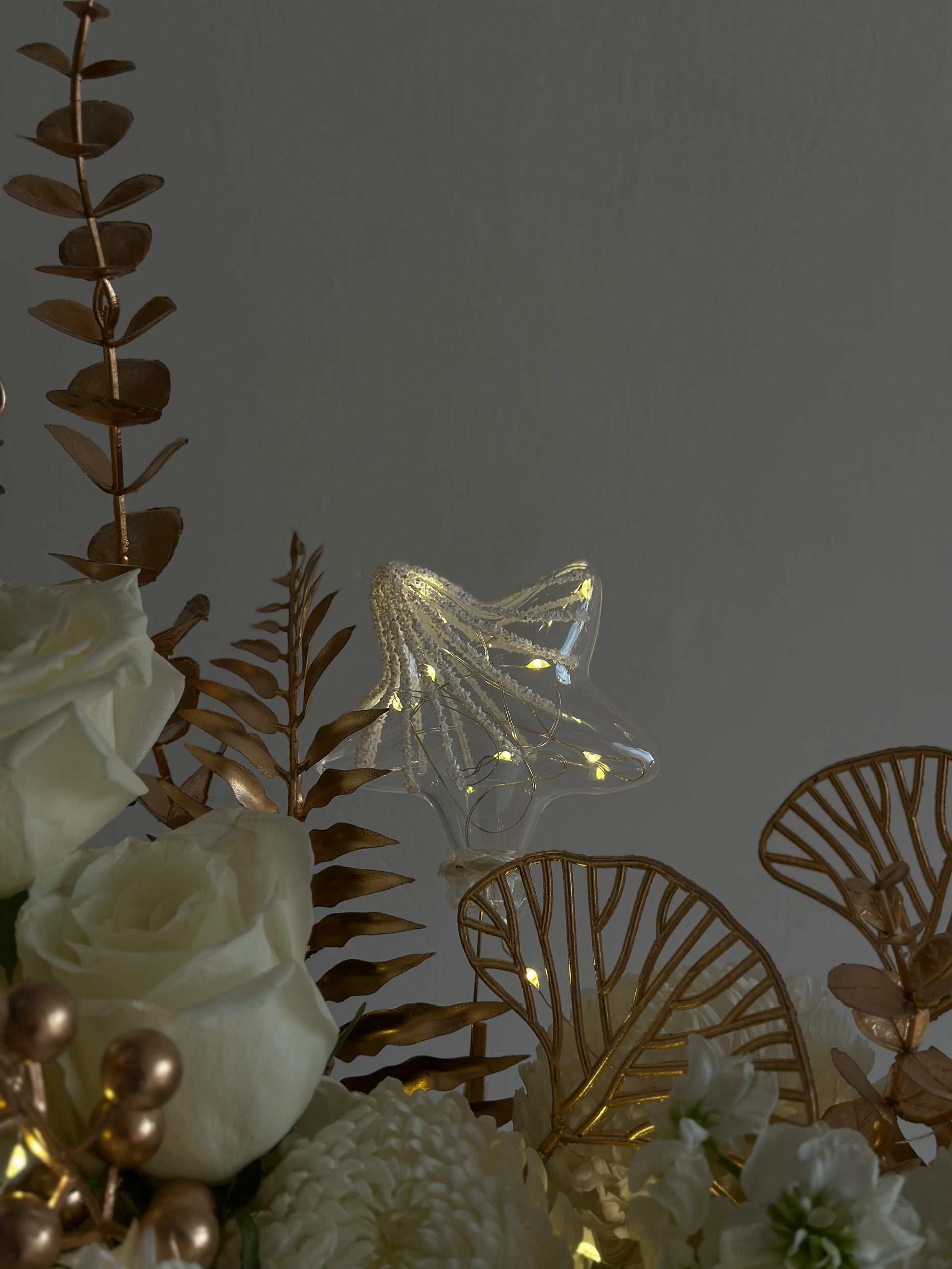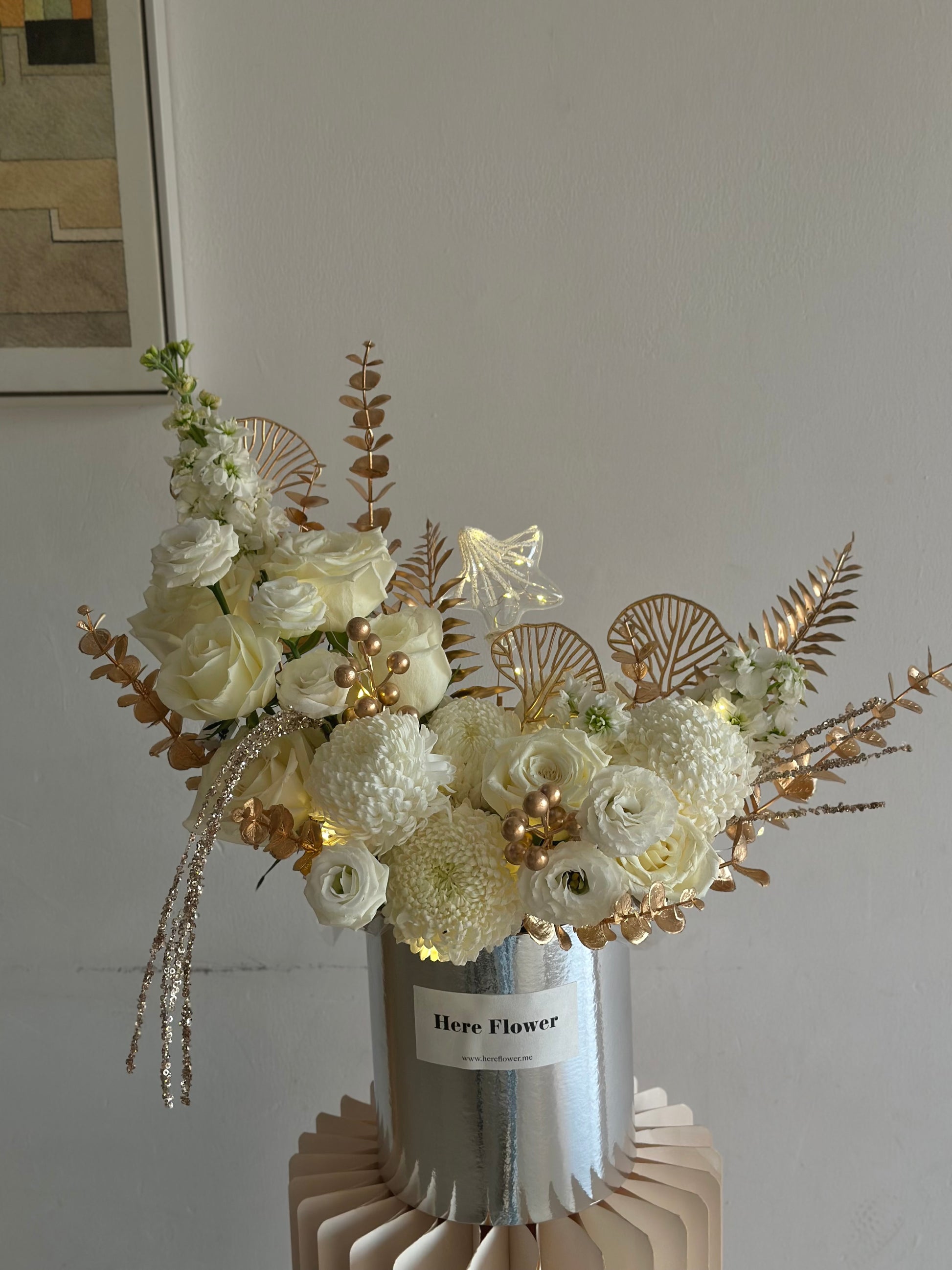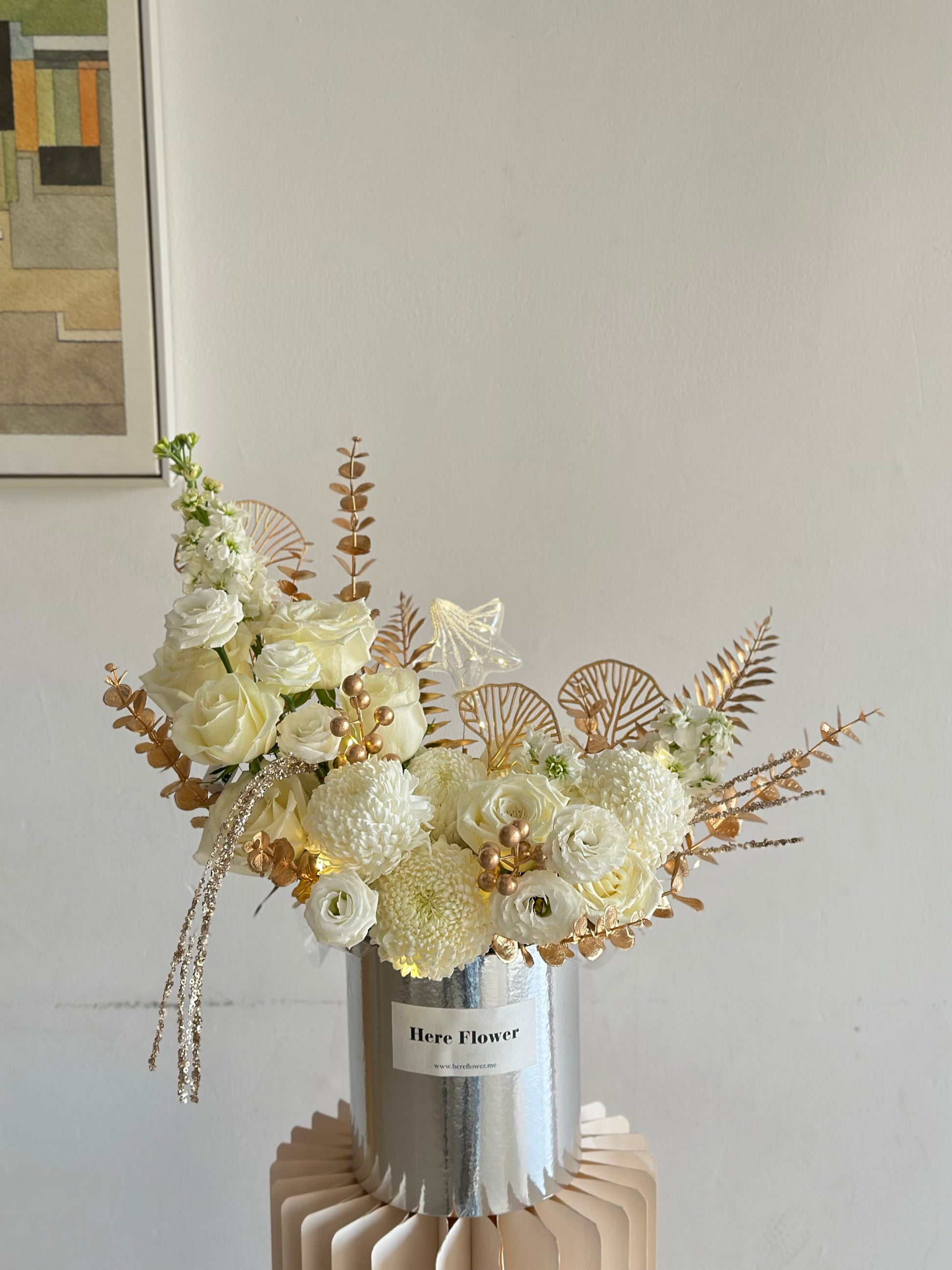Featuring elegant ivory blooms complemented by luxurious golden accents, Ramadan Blessing symbolises light, peace, and barakah. Presented in a modern metallic vase, this design brings warmth and refinement to any home.