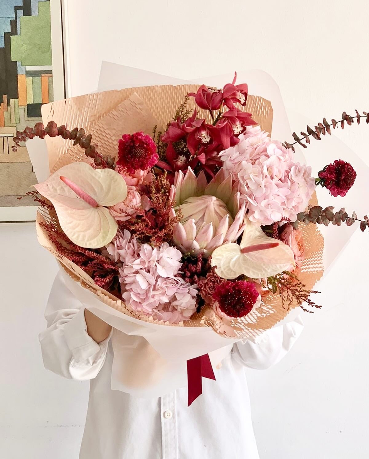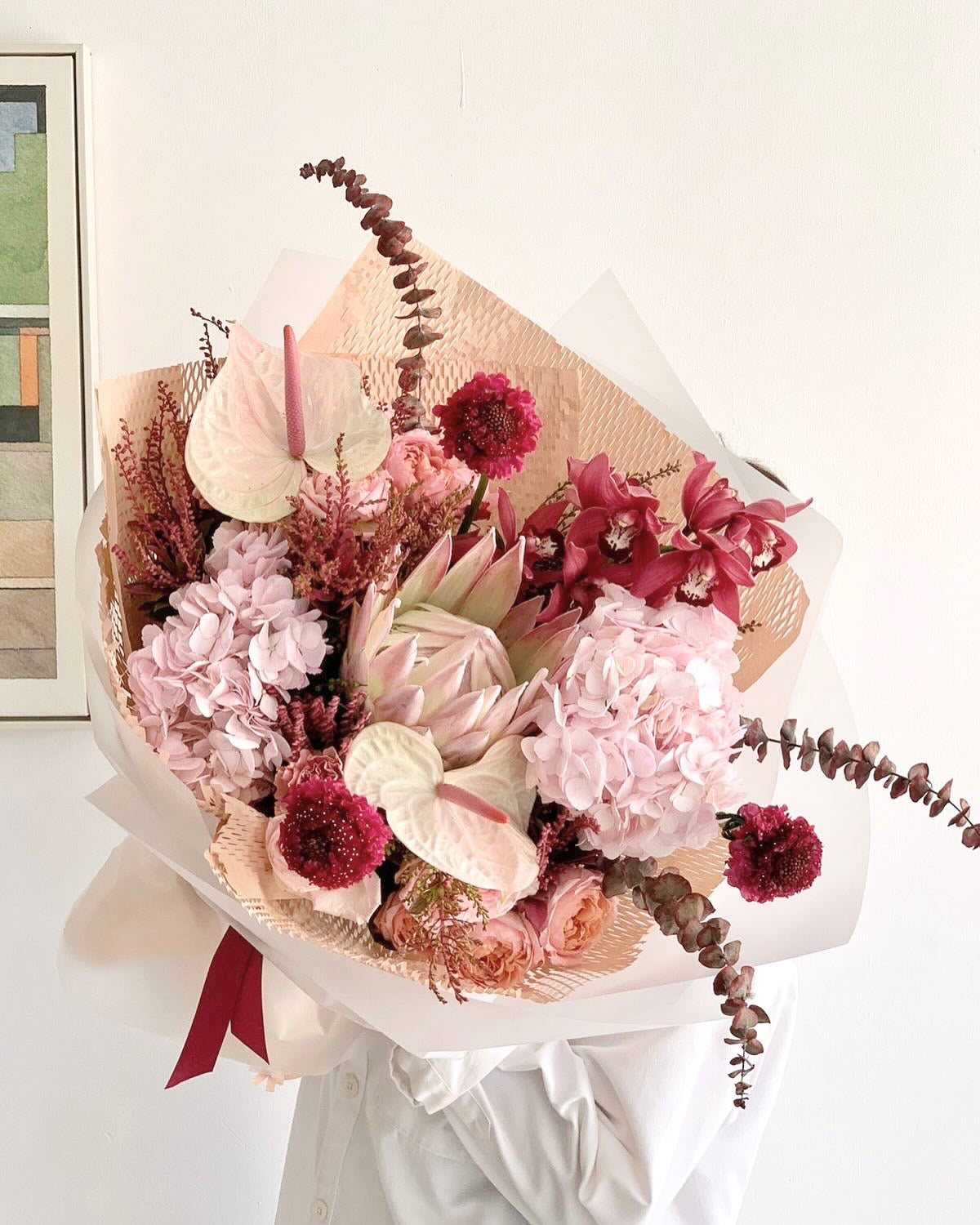 "Rosewood Symphony" is a captivating blend of soft pinks and deep burgundies, harmoniously arranged to evoke feelings of romance and warmth. The bouquet features lush hydrangeas, striking proteas, and delicate roses, complemented by vibrant scabiosa and elegant orchids. The white anthuriums add a refined touch, while the cascading eucalyptus and textured wrapping create a timeless, natural aesthetic. Perfect for celebrating love, milestones, or simply bringing joy, this bouquet makes a graceful and unforgettable statement.