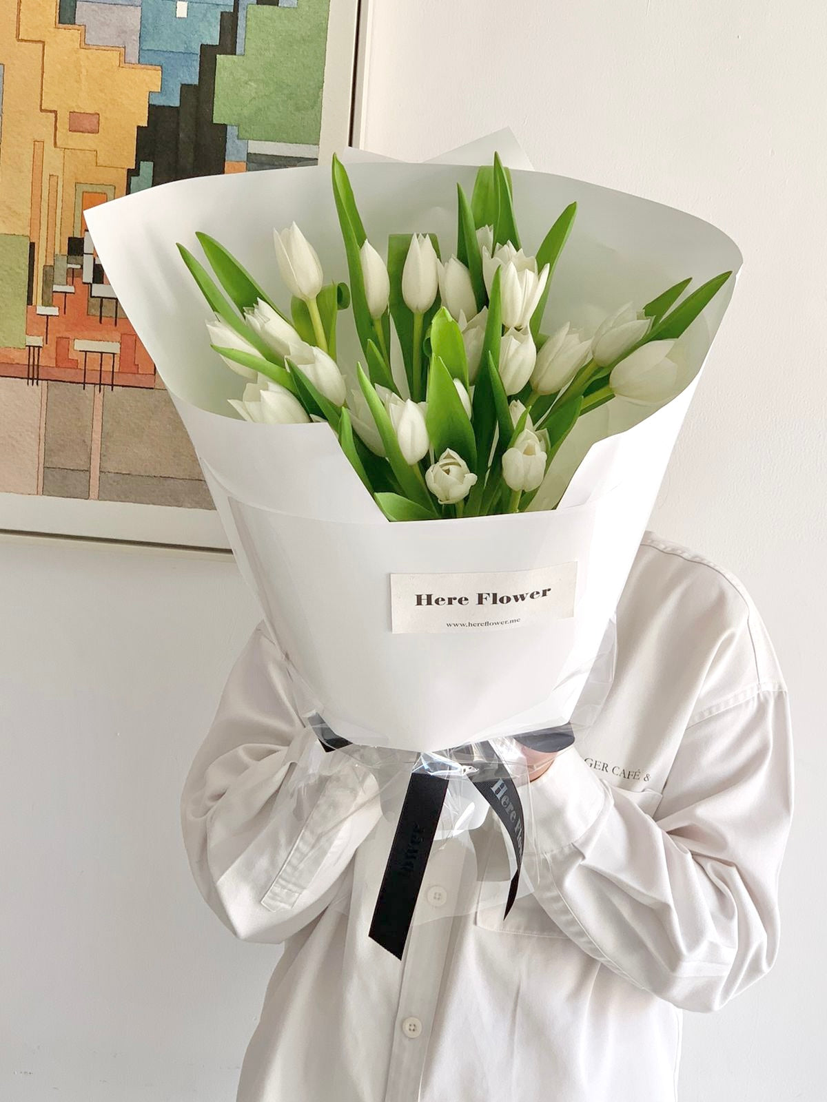 This elegant bouquet features a stunning collection of pure white tulips, arranged with simplicity and grace. The vibrant green leaves and delicate white petals create a fresh, minimalistic look that exudes a sense of calm and elegance. Wrapped in a sleek white cover, this bouquet is perfect for those who appreciate classic beauty and understated sophistication. Ideal for moments when you want to convey purity, appreciation, or a gentle reminder of love and care.